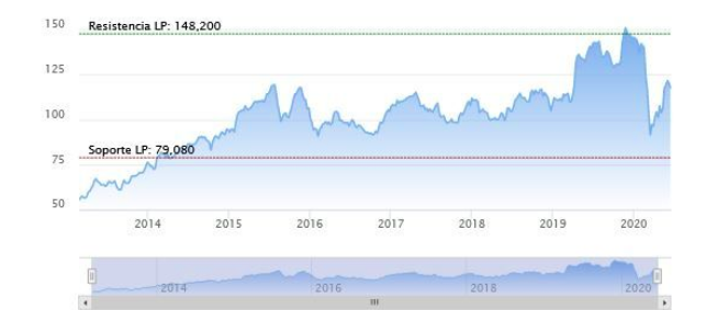 En su gráfica de cotización observamos cómo se ha filtrado el efecto coronavirus. Pero también la recuperación de más de un 32% de su valor desde abril, y en lo que va de año su saldo negativo supera el 17%. Además se encuentra a más de un 22% de sus máximos registrados el pasado mes de noviembre cuando comenzó sus emisiones Disney+. En los últimos cinco días el valor ha perdido un 6% y ha ganado más de un 9% en el acumulado del último mes.
